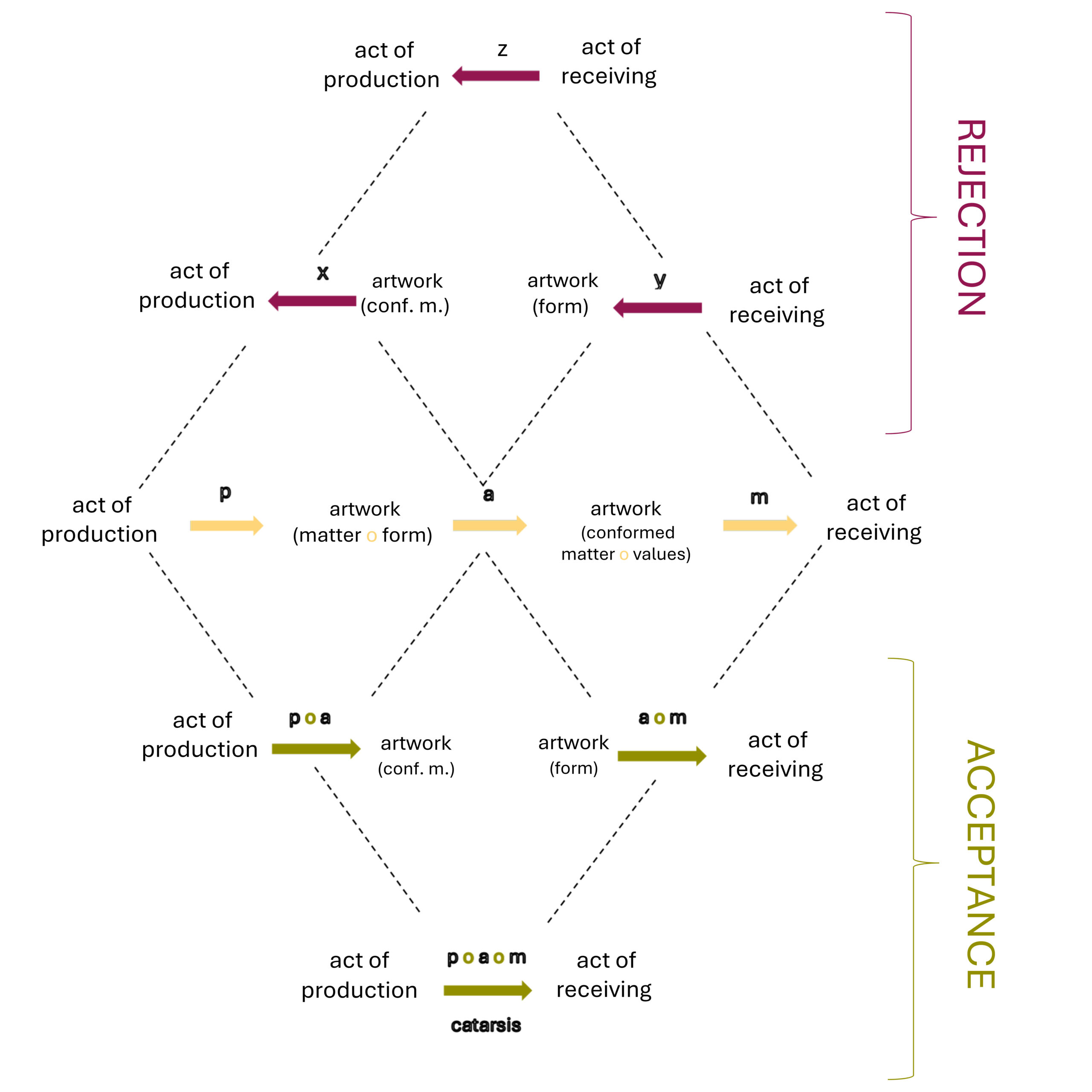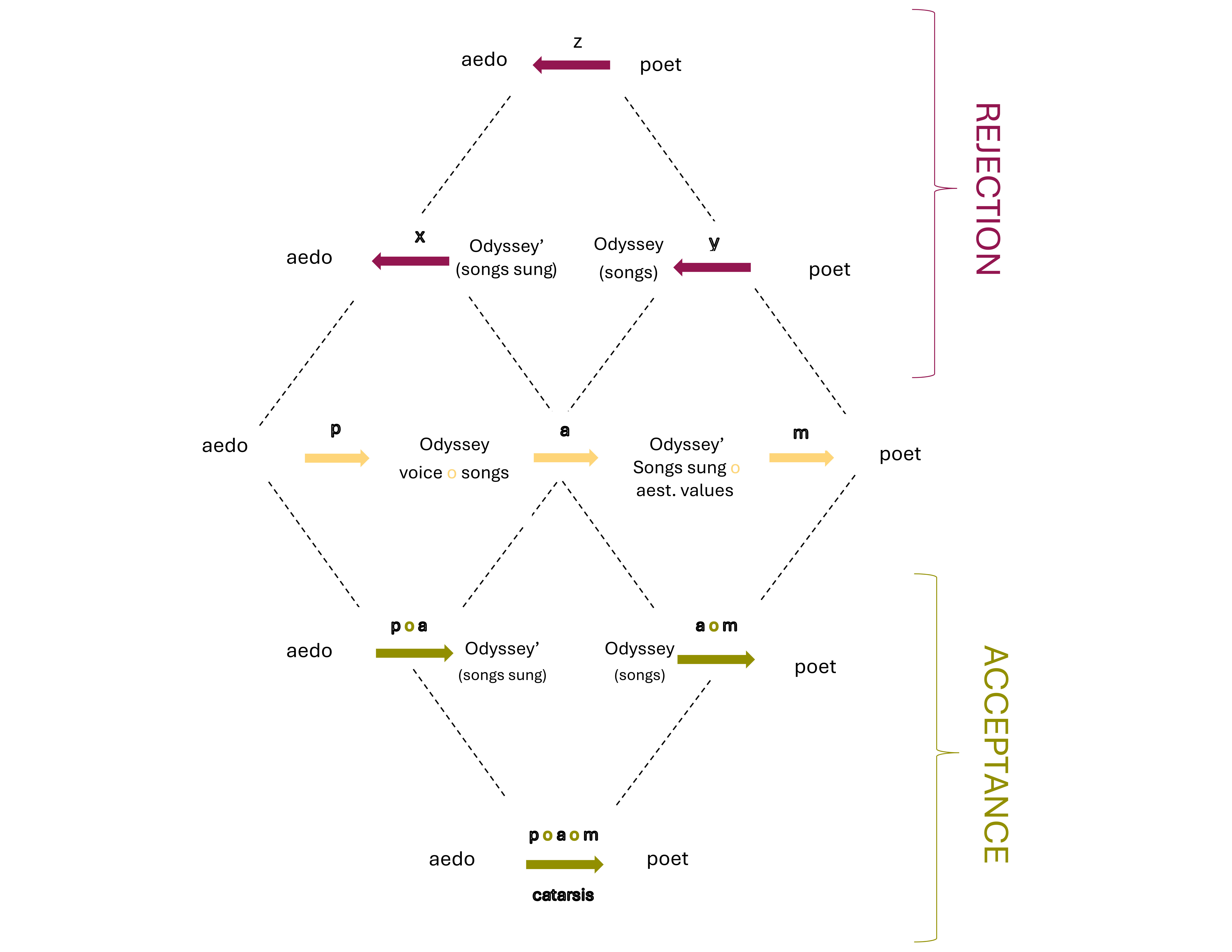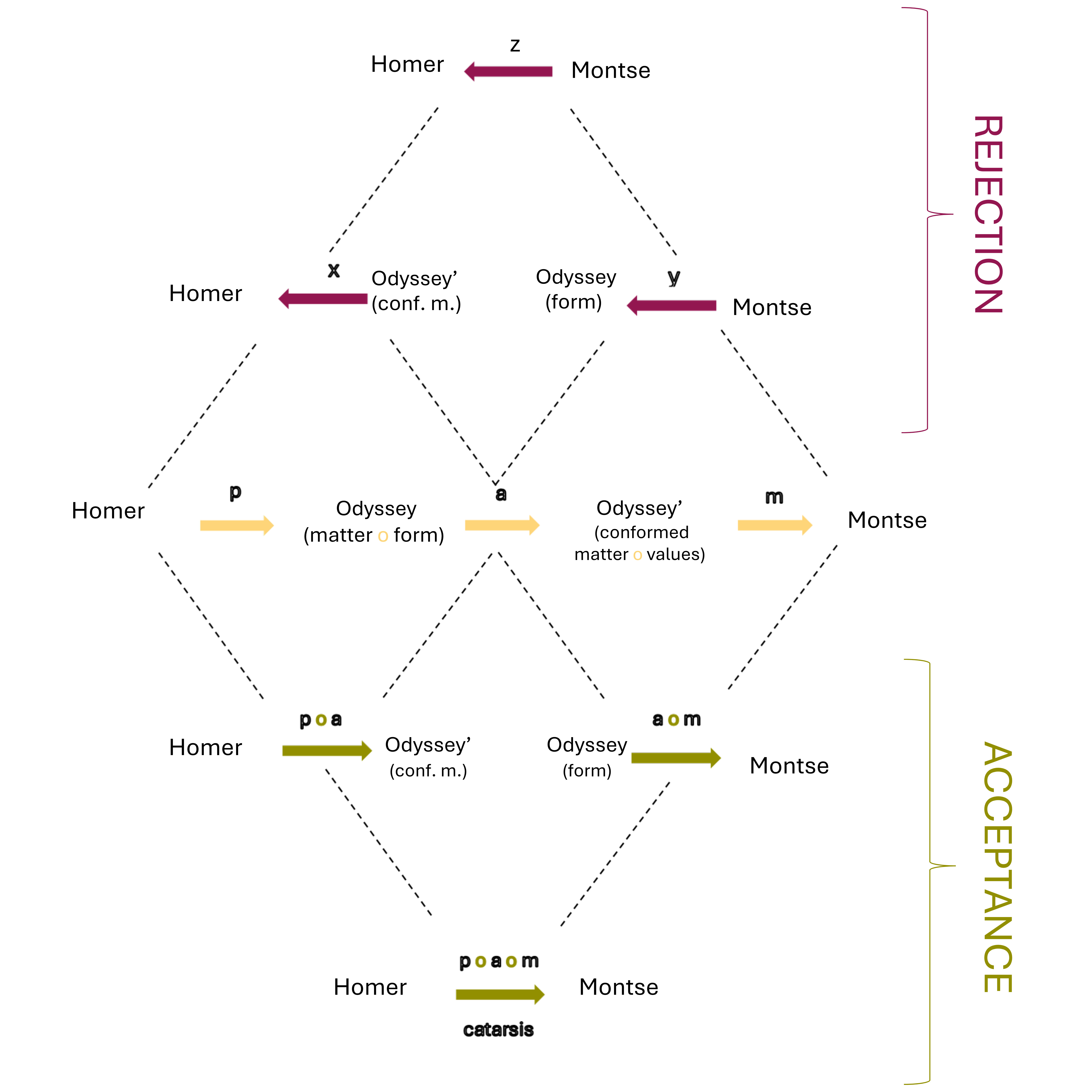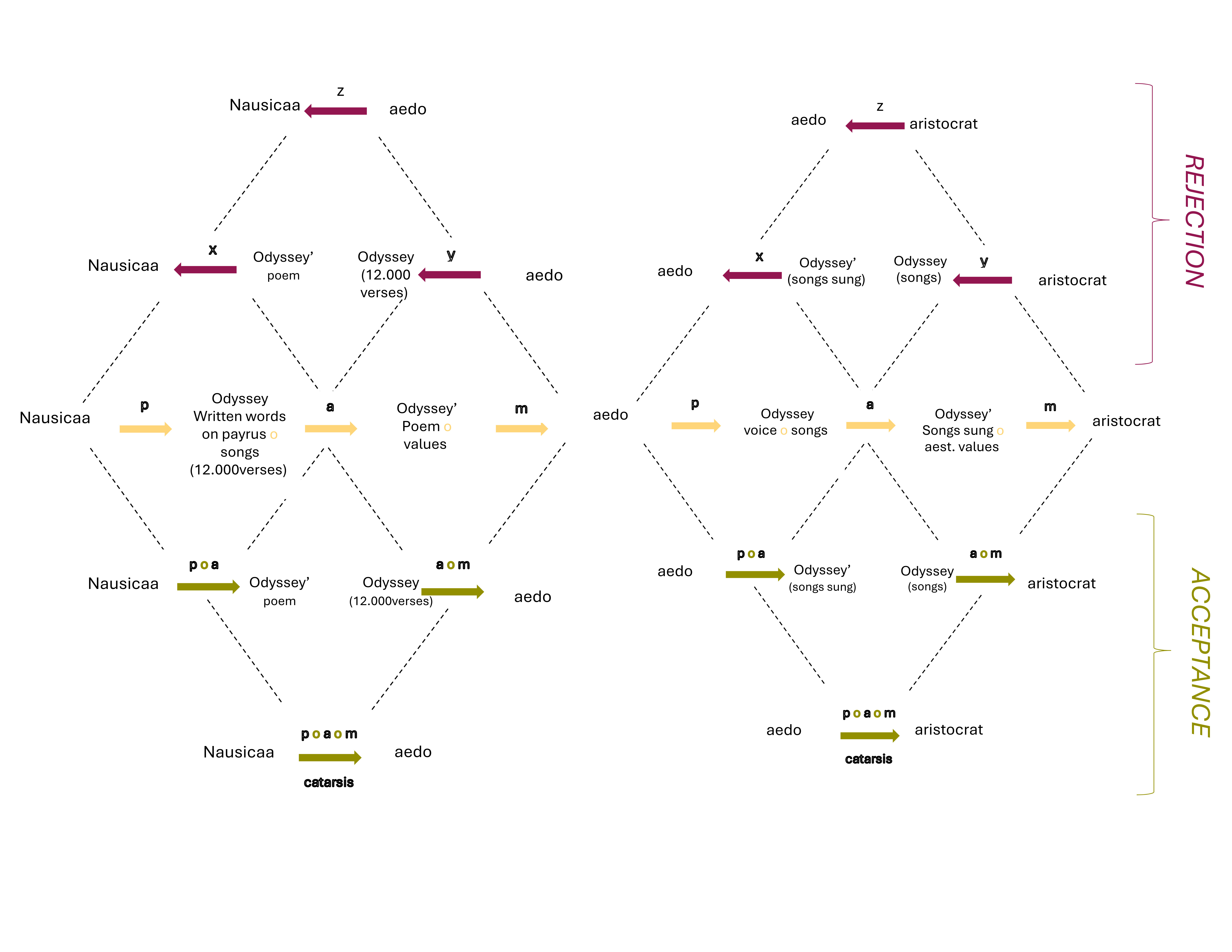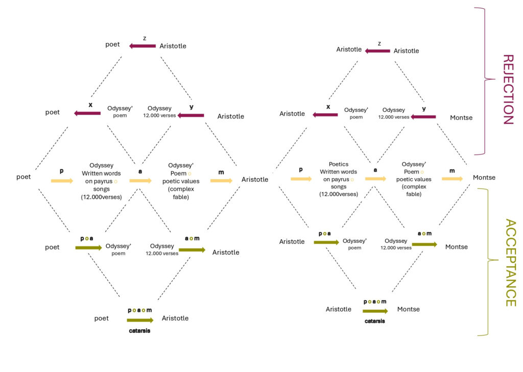 Let us look at the relations of categorical composition that take place in the zone of acceptance, that is, those that indicate the steps that must be fulfilled according to Rudolf Kaehr’s diamond for this aesthetic experience to be effective. Starting from the left we see the first composition (p o a), which composes the poiesis with the apate. It is of great importance because it is linked to the content of the work: it articulates the structure of the object that has been made by the artist, and the structure taken by the receiver. It connects Homer ––as the productive act of the Odyssey–– with the work I receive in the XXI century––the aesthetic object as conformed matter. The effectiveness of the aesthetic experience of a work of the VIII century B.C.E. in the XXI century will be linked to the articulation between the capacity of its materiality to produce an apate considering its poetic elaboration. The artist cannot control the illusory effect (apate) of his work, i.e. how the structure he has formed out of matter will behave over time, how it will be received. For this experience to take place centuries later, the aesthetic object produced must be able to appeal to my imagination, it must be adequate to my contemporary reception.