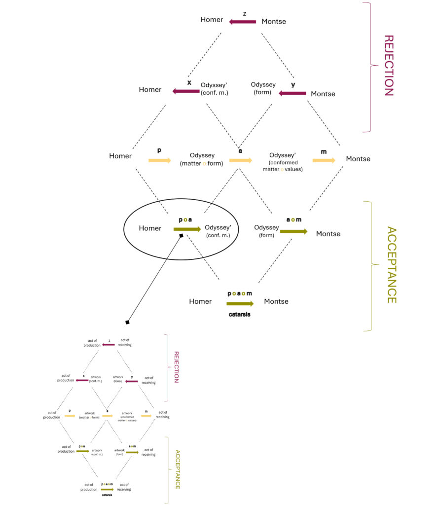 Similarly, the subsequent composition (a o m) is constituted by apate and mimesis. It links the Odyssey in its formal aspect with me ––Montse––. Although the work is not exactly the same, it has formal aspects ––like the structure, the themes, and the characters–– that I can perceive, apprehend and recognize despite the temporal and cultural distance. In this aesthetic experience, the receiver, Montse, connects with Homer through the formal aspects of his poietic elaboration, not through the matter ––Greek orality.