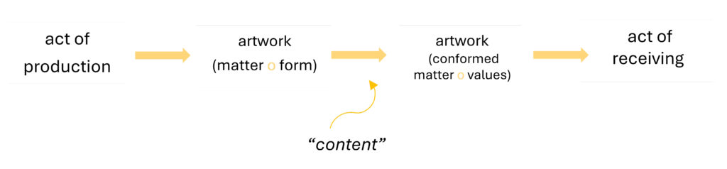 The expressions in brackets ‘matter o form’ and ‘conformed matter o values’ refer to the nature of the work of art according to Nicolai Hartmann, i.e. the composition of matter and form and the composition of matter conformed with values. The content appears in the work for reception, linking the sensitive objectual nature, as matter with form, with its behaviour in our aesthetic perception, as matter conformed to values (1977, p.100).