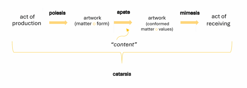 To describe the relationships that link these parts, we will apply the categories used by Jordi Claramonte in the second volume of his Modal Aesthetics: poiesis, apate, mimesis and catharsis (2021). Following Aristotle, Claramonte considers poiesis as the aesthetic activity of taking known elements and creating something new. Mimesis is the process of imitation that characterises reception, which, in perceiving something, identifies the other. Mimesis explores receptivity but is open to poiesis, to new elaborations that account for a specific sensibility (2021, p.171). Poetic elaborations connect us: those who produce the work provoke changes in a recognisable, mimetic structure, in a different way for those who receive it. On the other hand, the binding capacity of mimesis is manifested in the elements that allow us to connect with a work, to re-recognize its structure. Otherwise, we are confronted with an unrelatable object, aesthetically ineffective.