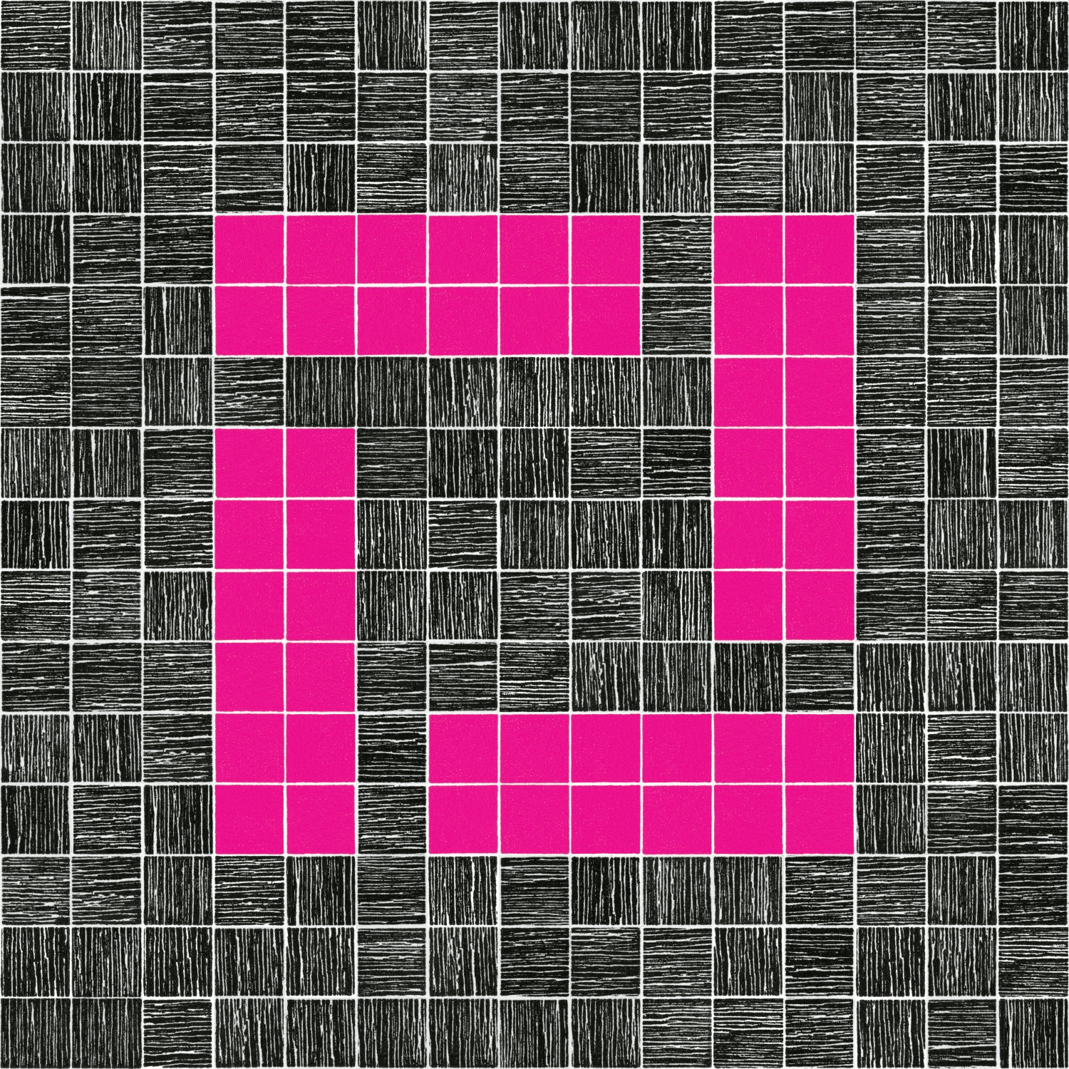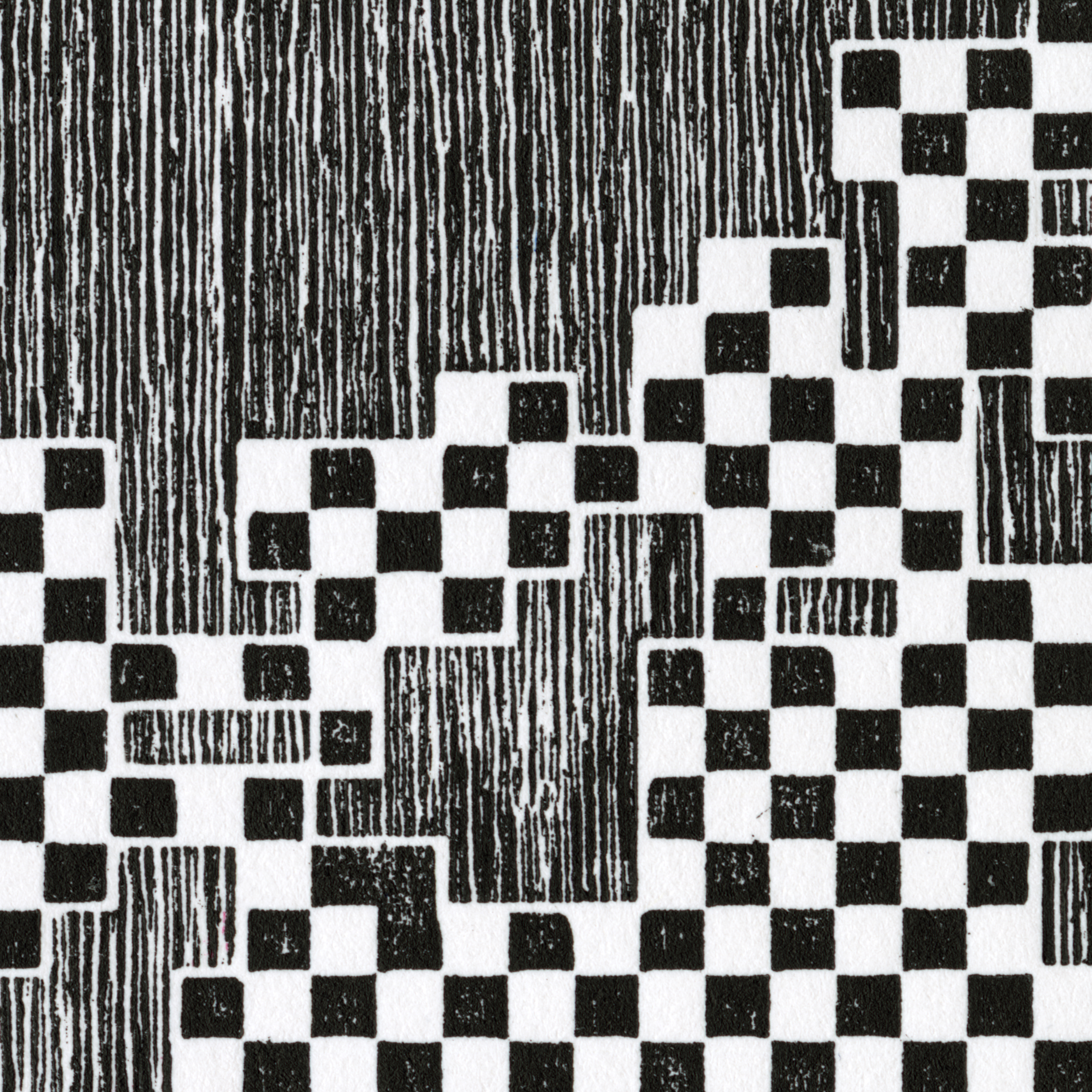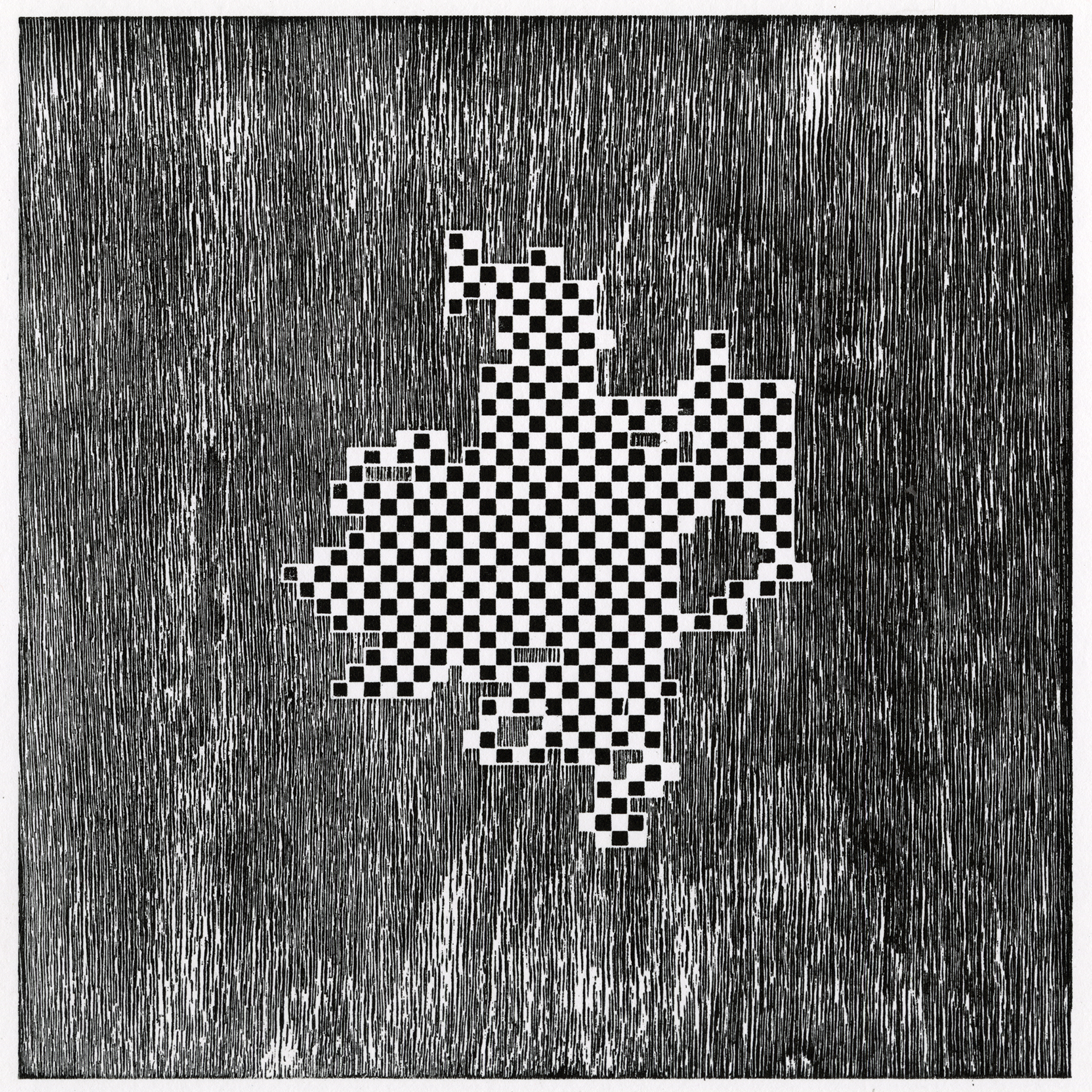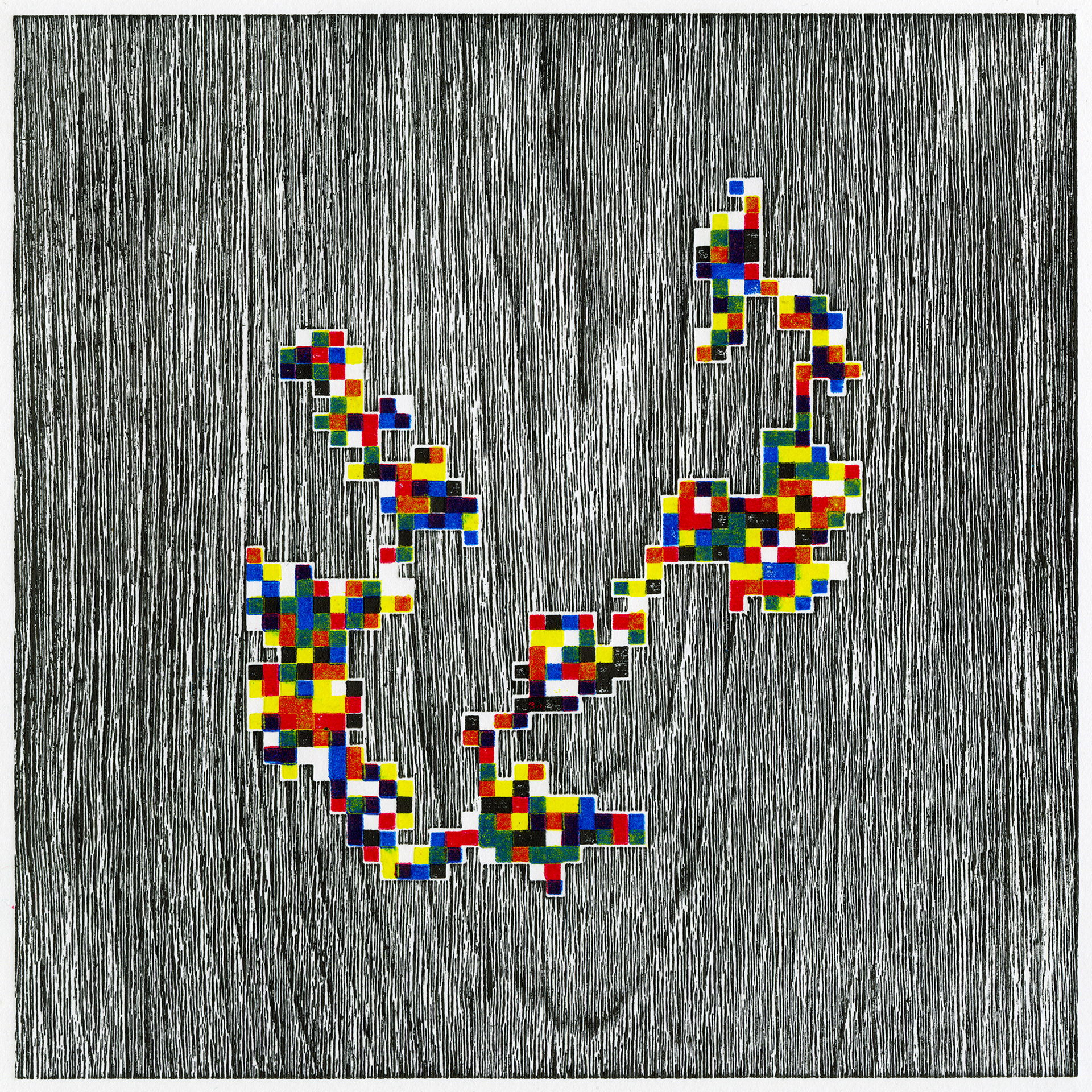 The Sum of Things is a series of woodcuts made from computer-generated “random walks.” Using the open-source Processing language, I write looping algorithms that move a square across a grid according to the laws of chance. A random number generator selects values from one to four, with each number assigned a direction along the grid’s x and y axes: the square “walks” either up, down, left, or right. Depending on the variables chosen, the color of the square changes — sometimes assigned randomly, sometimes alternating between black and white, or cycling between CMYK process colors. After running the program 1,000 times, the resulting image is saved and then engraved onto a woodblock using a laser cutter. The block’s grain is “raised” using a wire brush and the walk is nested within it like a jigsaw puzzle. When printed, two forms of chance are merged on paper: the geometric random walk and the natural patterns of the wood grain.