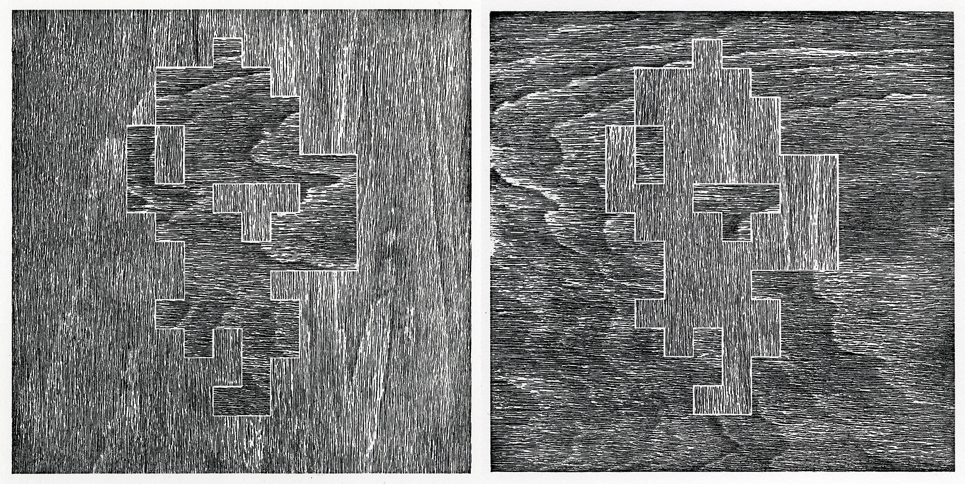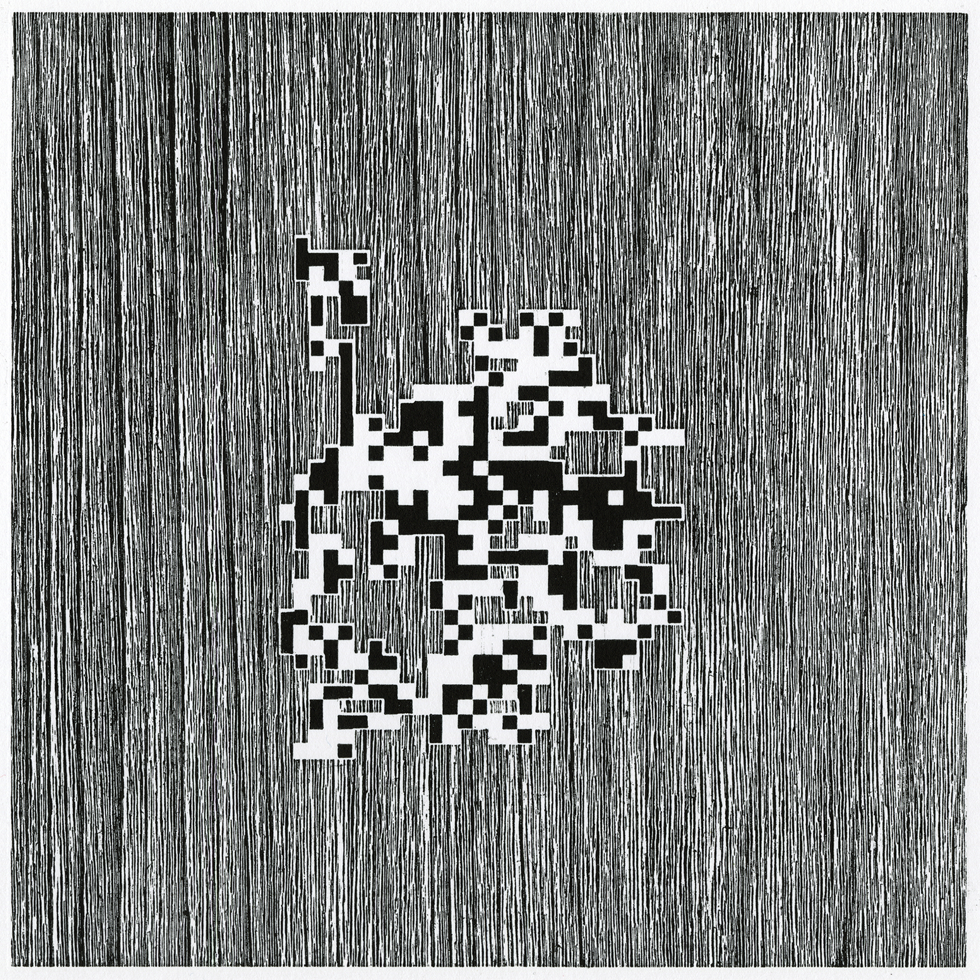 When I was learning how to code, one of the programming examples I encountered was The Game of Life. Invented by mathematician John Conway in 1970, the game consists of a grid of pixels that can be either “alive” or “dead”. Depending on the amount of “neighbors” each pixel has, a pixel stays alive, dies, or multiplies. When the program runs, depending on the initial pixel configuration you select, these simple rules create hypnotizing patterns of little squiggly spermatozoids moving, combining, dying, pulsating, oscillating, and looping. In other words, they look like natural formations and in some cases, living. Here’s a self-looping pattern that resembles the formation of a galaxy (found by Jan Kok in 1971) and translated using my hand-printed woodcuts: