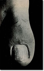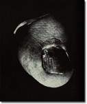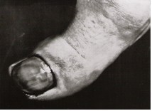 The fetishistic photographic process confers the big toe with a new status as part-object ready to be mapped out by desire and sexualised. The big toe's sexual persona is here evidently exposed as obscene. Boiffard has mimicked the fetishist gaze observed by Binet. The toes are isolated from their bodies, fragmented, enlarged, staged and dramatised. The magnified, blown-up toes seem impossibly real: ugly, hairy, genital-like. We are literally put face to face with their excessive and nauseous reality. The photographs are cropped, the angle imposes a violent deformation on the toe – they are upside down, brought down if such an operation were possible. It is a portrait that transgresses and subverts the very idea of what a portrait should be: the highest and most noble part of the body has been thrown away and transformed into a grotesque, absurd and scandalous ‘other face'. The framing of the toe is an act of violence set against the human figure. Bataille's text refers to material and visual operations of abuse and violence such as “deformation”, “infection”, “tortures”, “pain”, “brutal”. Those forces that deform the human figure are violent forces that Bataille equates with forces of entropy and decomposition, such as those that attack the corpse. The deformation or “alteration” of the human figure was an essential strategy in Bataillean aesthetics: “the word alteration provides the double advantage of expressing a partial decomposition similar to that of corpses and at the same time the expression of the passage to a perfectly heterogeneous state that the protestant professor Otto named the ‘wholly other', that is the sacred.” [8] In his classic study of the Holy, the German theologian, philosopher and historian of religions Rudolf Otto (1869-1937), situates the sacred in relation to an a priori emotional structure, the numinosum . In the experience of the numinous, the subject experiences a feeling of intimate dependence towards a higher and independent force. The experience of the “wholly other” [9]: is what Otto describes as “creature-consciousness”. This “creature-feeling” is “the emotion of a creature, abased and overwhelmed by its own nothingness in contrast to that which is supreme above all creatures.” [10] This experience is fundamentally ambivalent, a mélange of attraction and repulsion: this mysterium tremendum is an uncanny experience of awfulness, an awfulness that lies beyond the realm of knowledge, producing a feeling of peculiar dread, a “terror fraught with inward shuddering.” [11] The big toes reek of these creepy “creature feelings”. Boiffard has also captured the fetish's destiny as fixation. William Pietz, one of the leading commentators on fetishism, defines the fetish in the following terms: “The fetish is always a meaningful fixation of a singular event; it is above all a ‘historical' object, the enduring material form and force of an unrepeatable event.” [12] This unrepeatable and traumatic event could be rooted in early childhood beliefs and complexes. Freud and psychoanalysis argue fetishism is linked to the experience of shock that comes about once the absence of a maternal penis is revealed. The fetish becomes a substitute for the penis and a disavowal of that lack. The captions for this big toe could be: “it is not really gone as long as I'm here”. The body as site of revelation of the phallus was a common surrealist visual strategy. One of its most famous expressions is Man Ray's anatomies (1930). The idea behind that specific visual operation was to de-territorialise bodies, rendering them polymorphously perverse and ‘genital' by liberating desire from the conventional and limiting mappings of the erogenous zones.